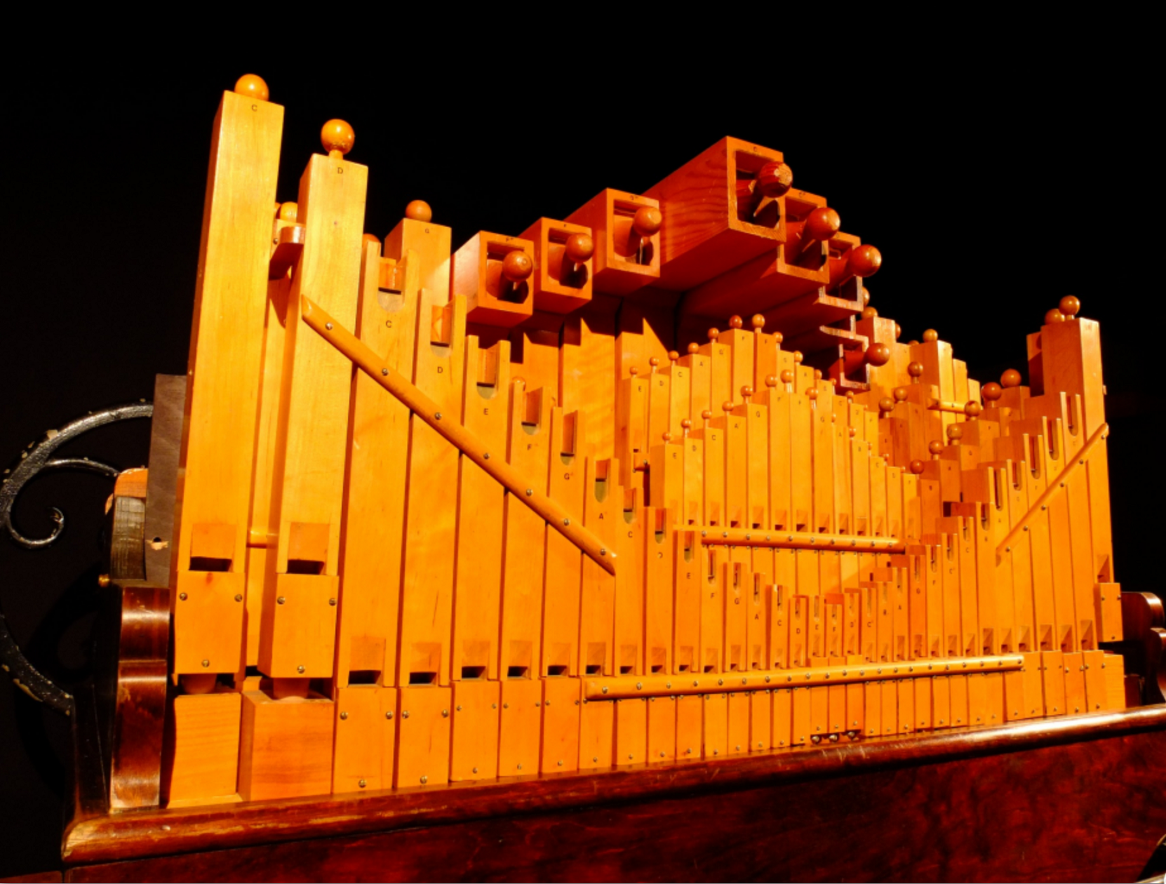 114 flûtes, 3 registres, 42 bordons, 12 doublures de basses, 30 bourdons célestes, 30 flûtes ouvertes
