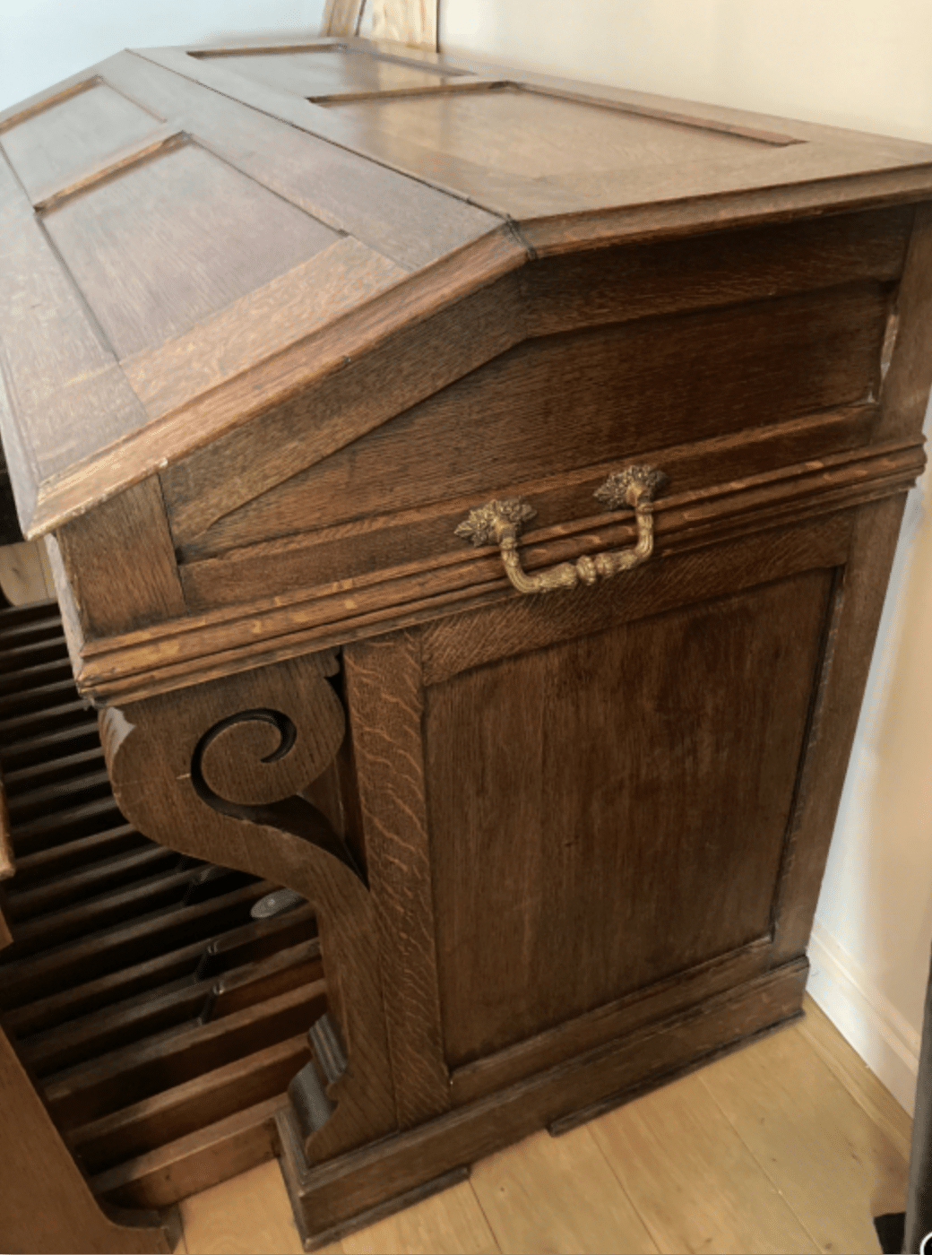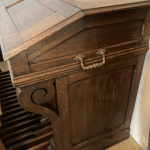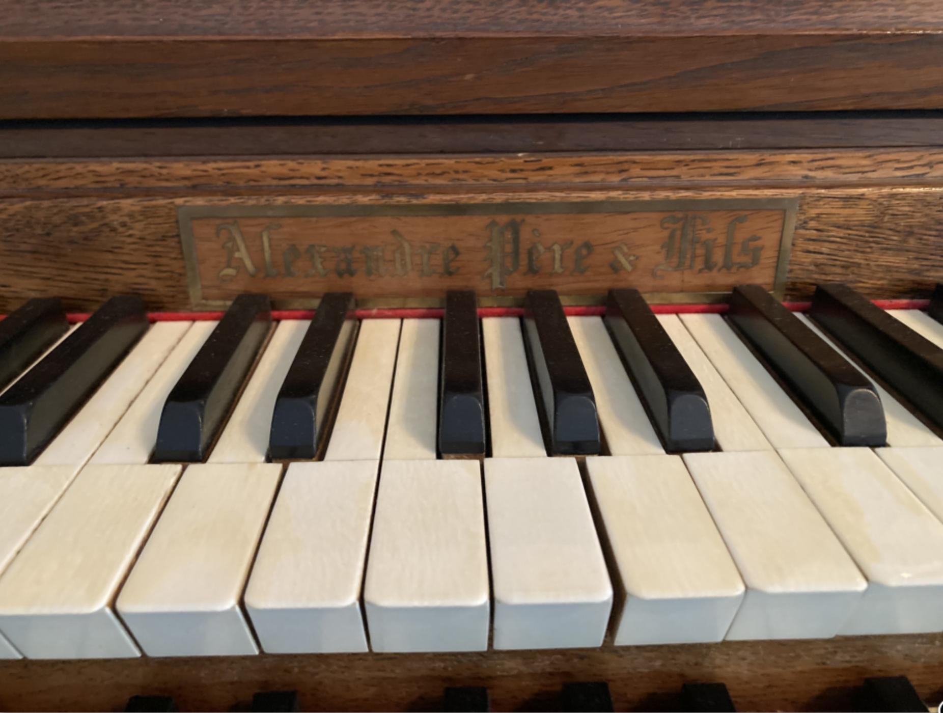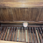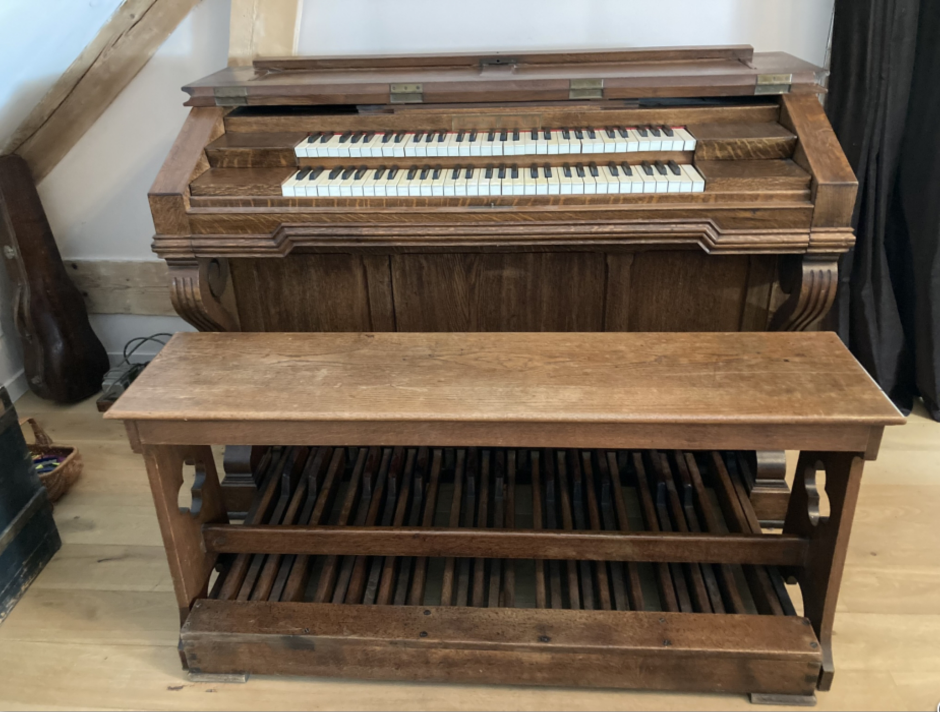 Harmonium à pédalier Alexandre, claviers de 61 notes et pédalier de 30 notes. 4 jeux permanents : 8 mordant au II, 8 rond au I, 16-8 à la pédale. Dispose également d’un accouplement des 2 claviers ainsi que d’une pédale de Forte pour le deuxième clavier. Il y a également une pédale expressive. Le moteur électrique, interne est en 110 V. L’instrument est en bon état mais nécessite une petite révision. Idéal pour l’’étude de l’orgue ce pourquoi je l’avais acheté.