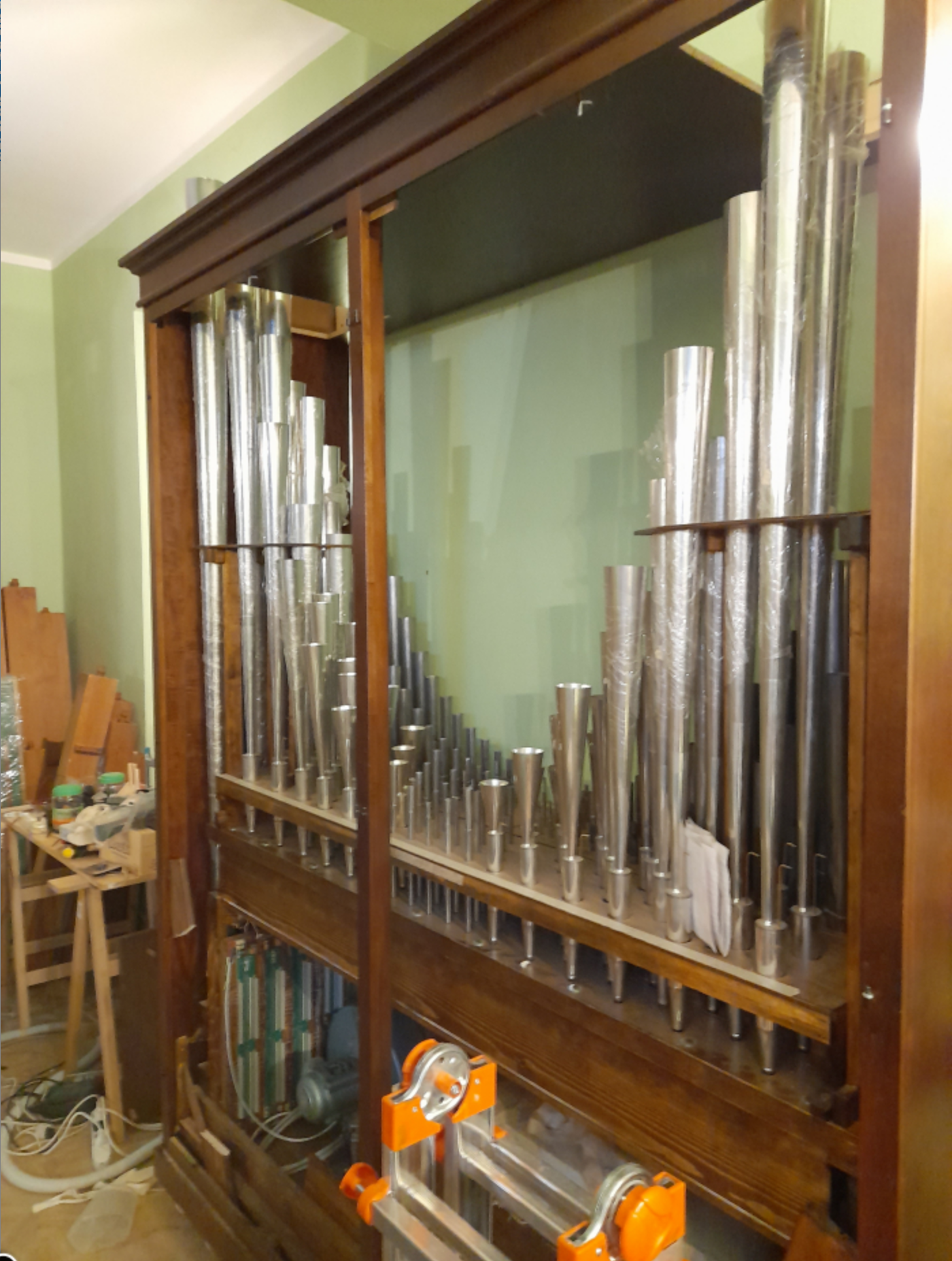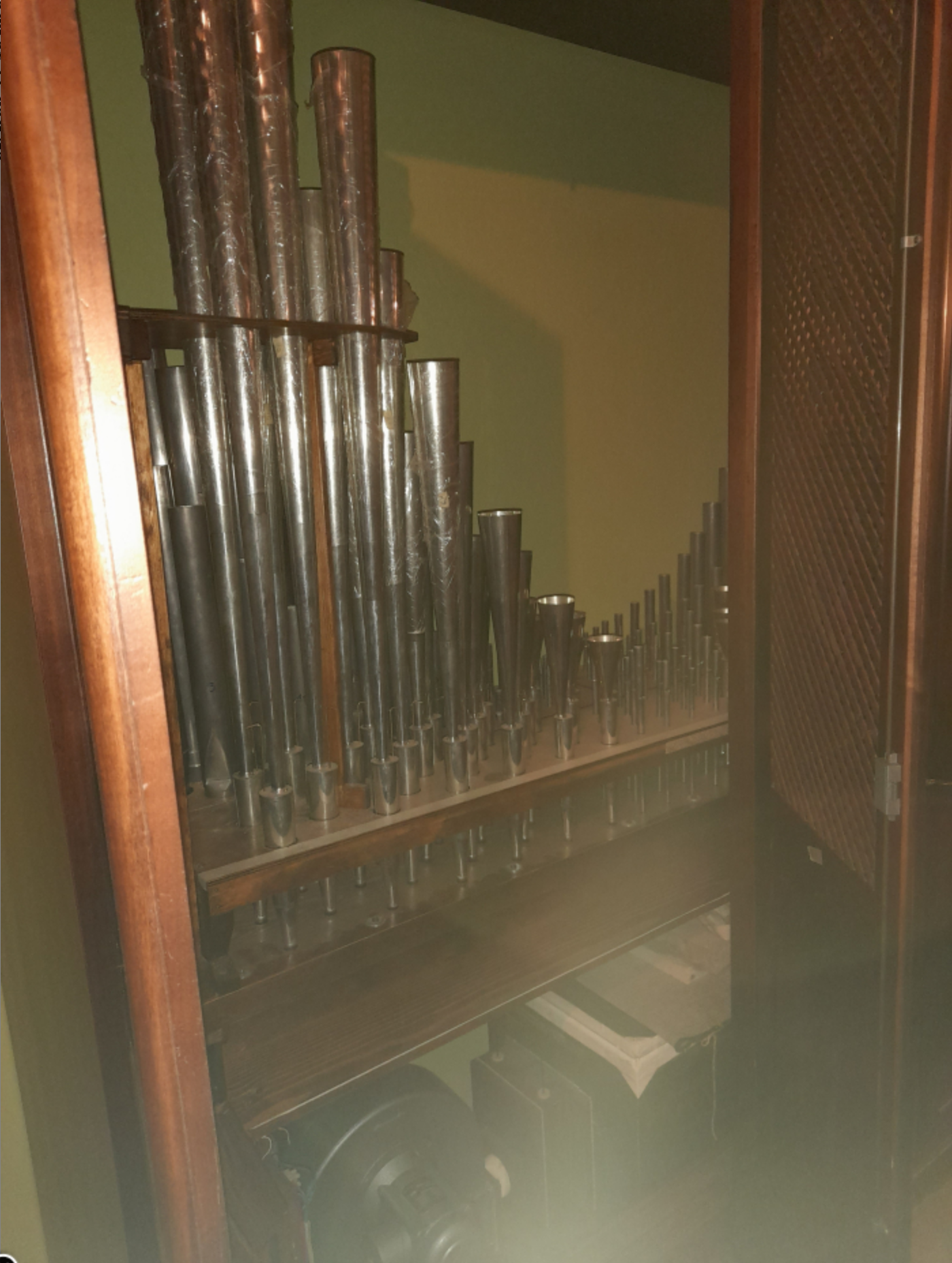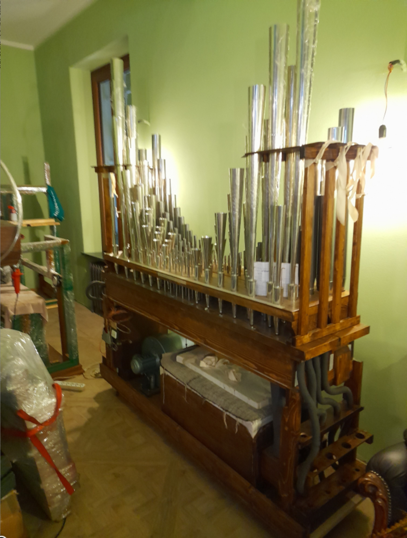 Avec soufflerie et réservoir. Pour agrandir un orgue à transmission électrique, avec câblage déjà prêt. Pression 60mm Dimensions Hauteur 270cm Largeur 2m Profondeur 65cm État neuf, tout matériel nouveau. Réalisé par un facteur d’orgue italien en 2021/22 A chercher sur place dans la ville de Romanengo (CR), 50km de Milan.