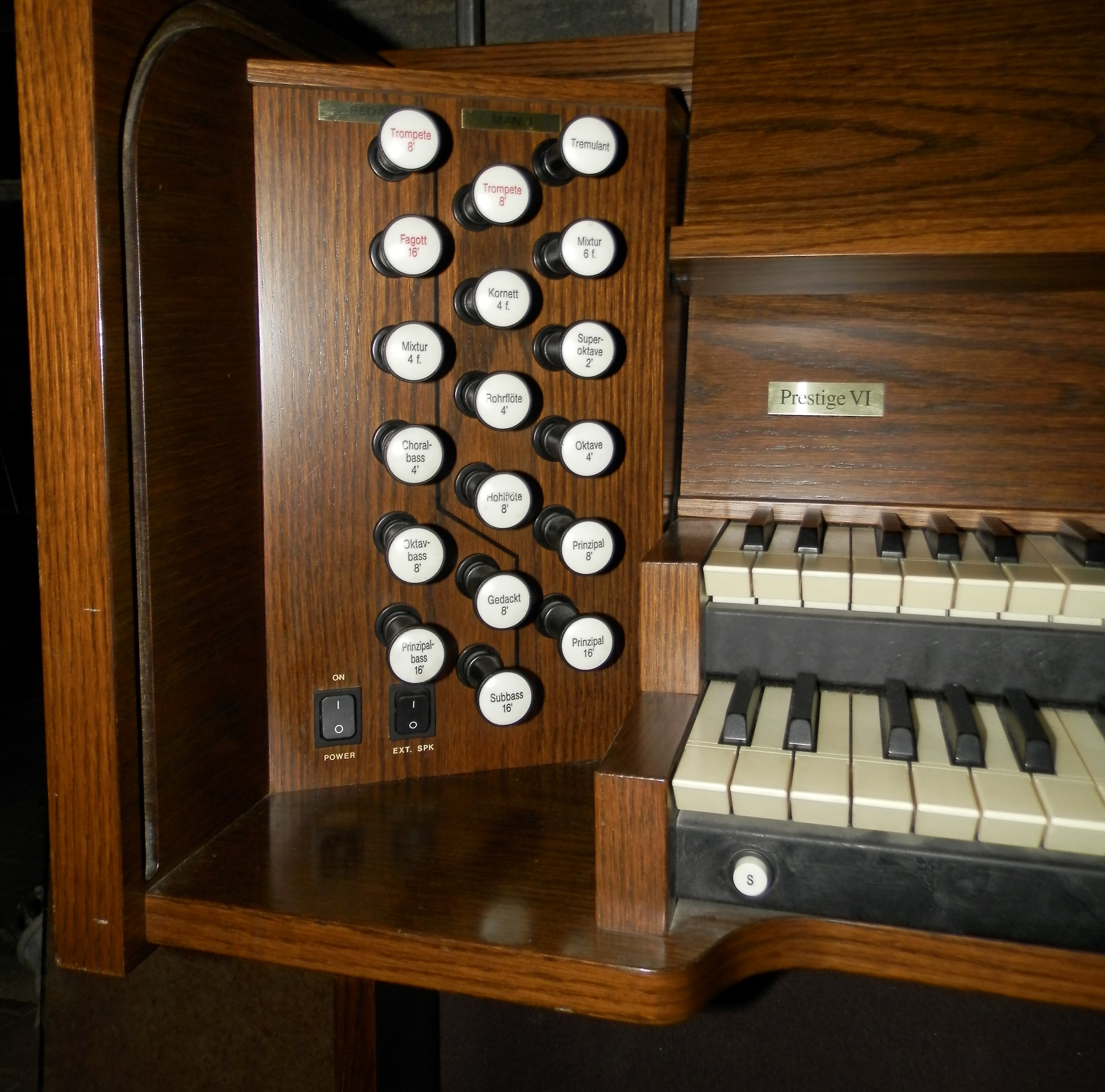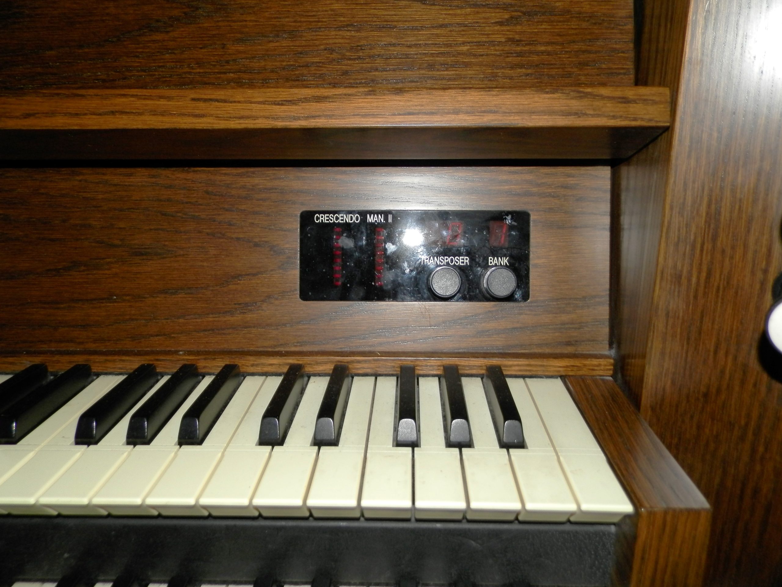 4 pistons , pédale d’expression et de crescendo, accouplements, 8 banques de 6 mémoires. reverbération réglable , transpositeur , entrée aux. sorties aux. etc…